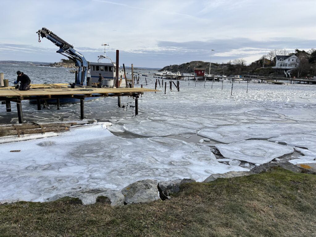 Aktuella nyheter: Arbetet på omläggningen av bryggor pågår trots att vädret inte underlättar. Skall vara klart den 31 mars.